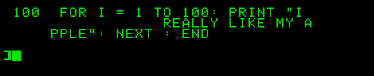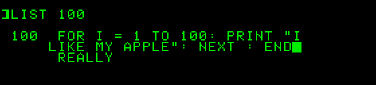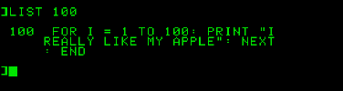 To change that line so the PRINT statement read “I REALLY LIKE MY APPLE” meant either retyping the entire line, or using the edit feature. (If the line was particularly long, it was preferable to edit rather than retype the entire line). To edit this line, you would have to move the cursor up to the “1” of “100” and begin pressing the right arrow key. When you got to the “L” of “LIKE” you would have to move the cursor above or below the line, type the word “REALLY” followed by a space, then move the cursor back to the “L” of “LIKE”, and continue copying with the right arrow key. After editing a line, the screen might look like this: